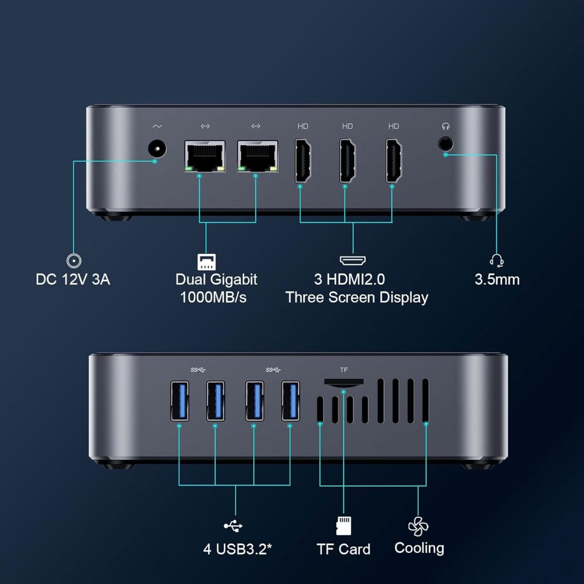 CPU Intel 12th Gen N95 Processor (Up to 3.4GHz, 4 Cores/4 Threads, 6M Smart Cache,15W TDP) Memory Card 32GB DDR4 (3600Mhz) Storage 1TB M.2 2280 SSD (Expandable up to 2TB) Wireless Connections Dual Band WiFi 2.4G+5G, Bluetooth 4.2 lnterface 4*USB3.2 Gen2(Transfer Speed: 1000MB/s), 3*HDMI, 2*Gigabit RJ45 (1000M/s), 1*3.5mm Audio Jack, 1*DC Jack(12V,3A), 1*CLR CMOS Reset, 1*TF Card Slot, 1*2.5” SSD interface Operating System Pre-installed Windows 11 Pro (More Comprehensive Features Than Windows 11 Home) / Compatible with Ubuntu and Linux (Please Install with Professional Guidance) Other Functions Power wake up, Wake on LAN, Network PXE boot Package Included 1 x Mini PC,1 x VESA mount, 1 x HDMI cables, 1 x Power adapter, 1 x User Manual Product Size 1.53*5.45*5.45inches Power Adapter Input: 100-240V AC, 50/60Hz , Output: 12V 2.5A 30W Cooling System Intelligent silent fan that automatically runs when the CPU temperature reaches 55 degrees Celsius. Supported Resolution 4096 x 2160 @ 60Hz Triple Screen Display Display the same content on all three screens/Display different content on each screen/Split into different sections to display various pieces of content.