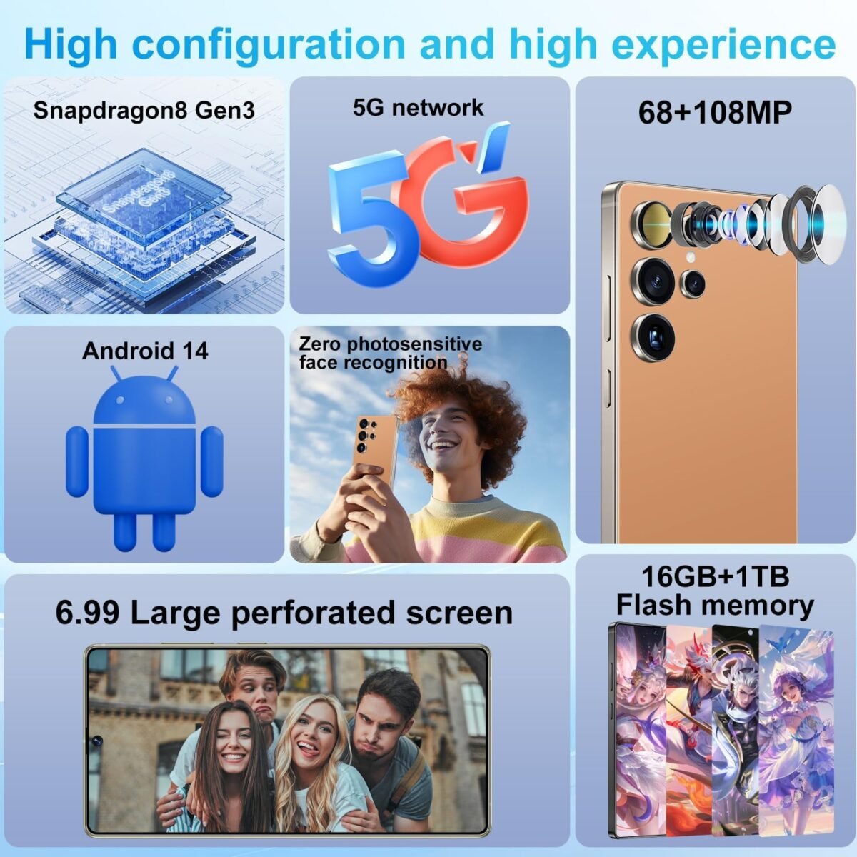 【6.99 HD+ Android 14.0】 This is an Android Cell phone with a large screen,6.99”HD+ Display 1440*3040,This unlocked Android 14.0 I25 Ultra phone is equipped with a 108MP main camera and a 68MP front facing camera, better recording a beautiful life and showcasing your beauty. And it has facial recognition and Fingerprint button unlock and Quick button for taking photos,which effectively protect your privacy.