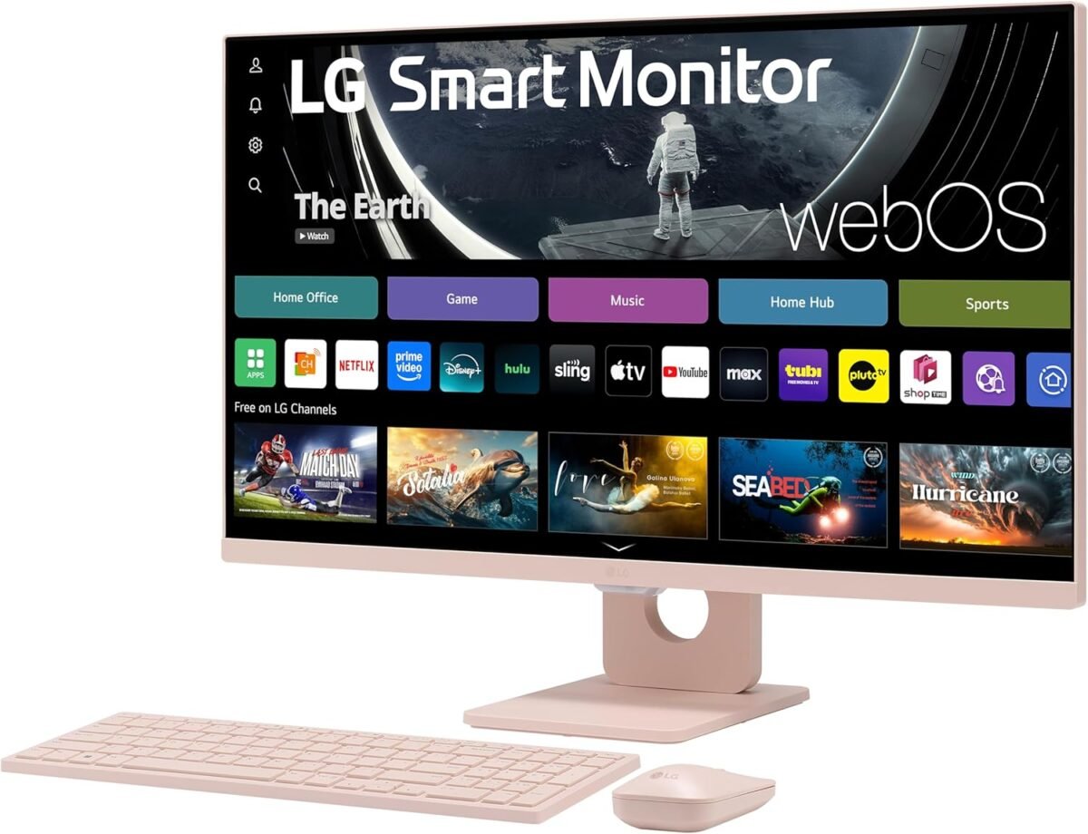One screen, endless possibilities with the pink LG Smart Monitor desktop combo! The 27ā Full HD IPS Smart Monitor ultimate desktop setup comes with the gorgeous pink display and matching wireless keyboard and mouse. The Smart Monitor display offers stunning visuals and a sleek design that’s perfect for work, play, and everything in between. Experience vivid clarity with the Full HD screen, bringing every detail to vivid life. Its slim design and flat style stand will stylishly blend into your desktop. Thanks to LG streaming platform webOS23. ¹Internet connection and subscription to streaming services are required. ²Home Office services support only Microsoft 10 and 11 or higher. Microsoft 365 and Google registration and subscriptions may be required. Separate services may require payment for subscription. Supported service may vary by country. ³Internet connection and subscriptions to streaming services are required. Amazon, Prime Video and all related logos are trademarks of Amazon.com, Inc. or its affiliates. Amazon Prime membership and/or Prime Video fees apply. See primevideo.com/terms for details. HBO Max⢠©2023 Warner Media, LLC. All Rights Reserved. HBO Max is used under license. Number of LG Channels subject to change. 4Your Apple device must be connected to the same Wi-Fi network as your monitor. Apple, the Apple logo, AirPlay, Apple TV, and HomeKit are trademarks of Apple Inc., registered in the U.S. and other countries. This LG Smart Monitor Desktop Setup supports AirPlay 2 and requires iOS 12.3 or later or macOS 10.14.5 or later. Internet connection and subscriptions to streaming services are required for streaming services.