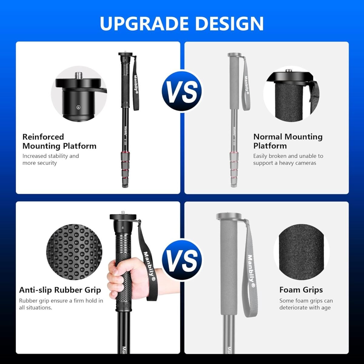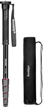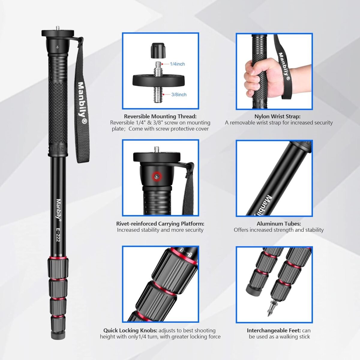 Travel Monopod: The Manbily E-222 camera monopod is a 5-section aluminum monopod and walking stick combination that rises to a maximum height of 65″, folds down to 19.7″, and weighs only 0.93 lb