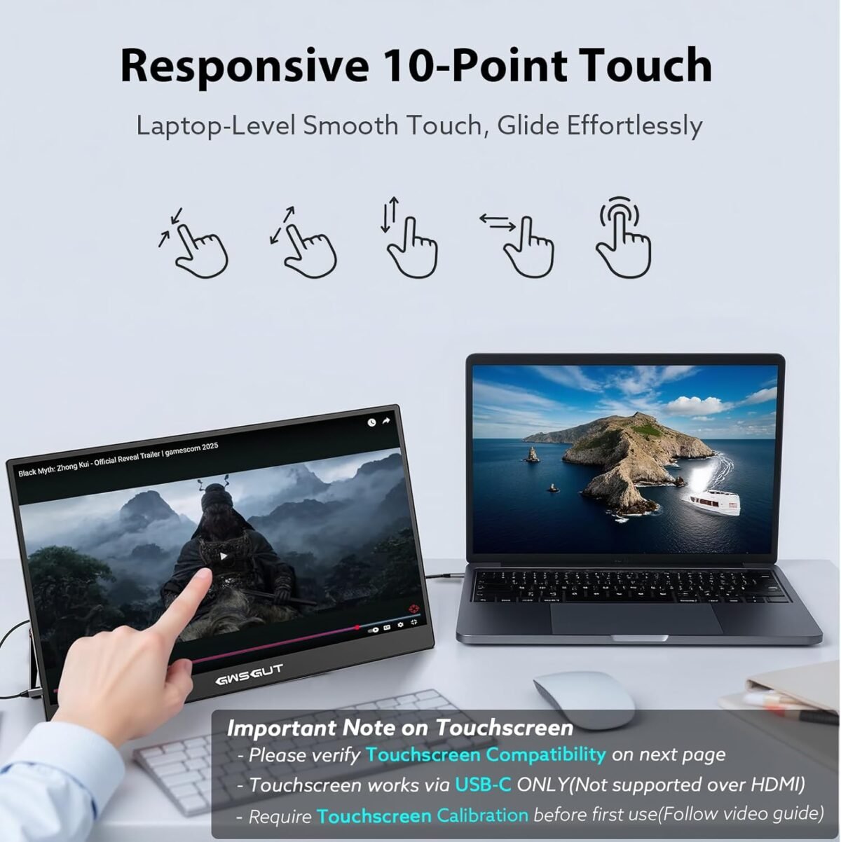 FHD IPS HDR Portable Laptop Monitor : The GWSGUT 15.6″ portable monitor touchscreen features a 1080P FHD resolution, 178° wide-viewing IPS panel, integrated kickstand allows for 0-180° angle adjustment with HDR and low blue light technology, delivering accurate color reproduction and stunning clarity for gaming, movies, and multimedia.