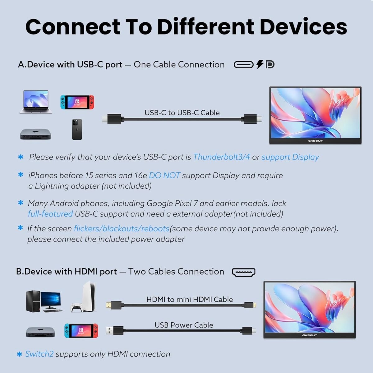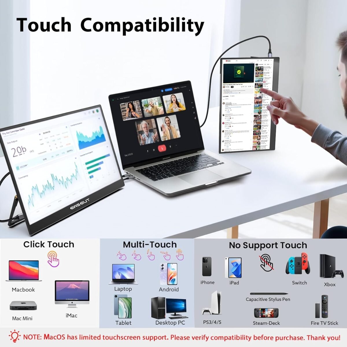 Universal Compatibility : Equipped with dual USB-C ports and a Mini HDMI port, plug-in and unplug tested thousands of times, it seamlessly connects to laptop, PC, Mac, smartphone, and gaming console like Xbox, Switch, and PS4/5—no driver required.NOTE: Some devices cannot support touch due to system protection. For example, PS3/4/5, Switch, X-box, Steam-Deck, Fire TV stick/cube and iPhone, iPad(It’s NOT the monitor’s problem).