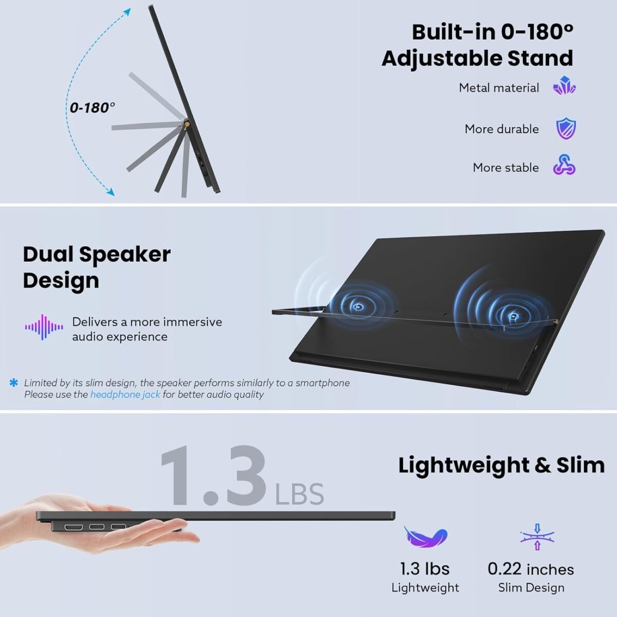 Ultra-Slim & Travel Monitor for Laptop : Weighing only 1.3 lbs with a 0.22-inch ultra-thin profile, can work in both landscape and portrait mode, can be used as a gaming monitor, screen extender for laptop or phone, no driver needed and equipped with 3.5mm audio inputs and 2 built-in stereo speakers to enhance entertainment experience this monitor fits effortlessly into your bag, making it the perfect companion for on-the-go productivity and entertainment.