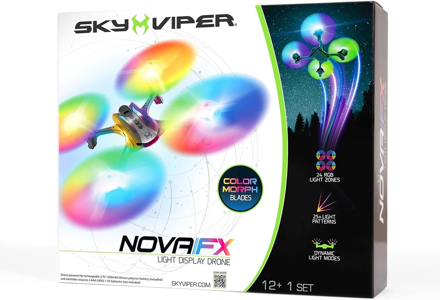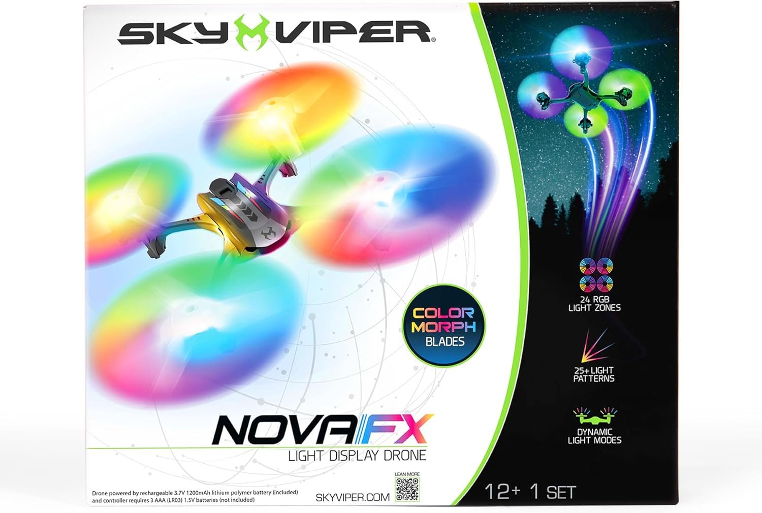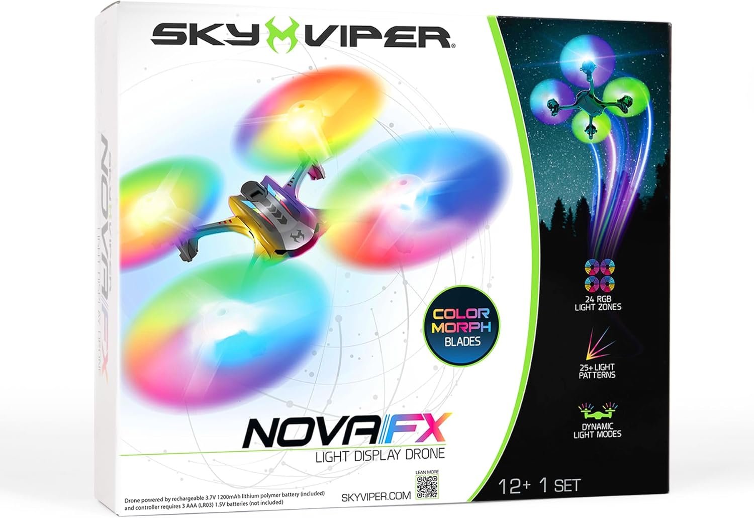 Sky Viper – Nova FX Light Display Drone / Color Morphing Blades – 24 RGB Light Zones – 25+ Light Patterns – Dynamic Light Modes – One-Touch Stunts – Removable Rechargeable 3.7V 1200mAh LiPo Battery with Charger – Includes Replacement Propellers.