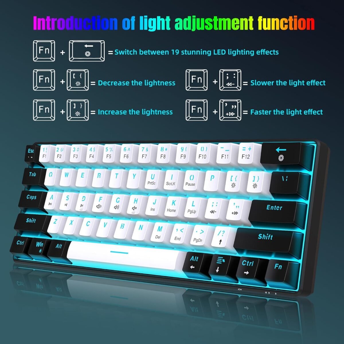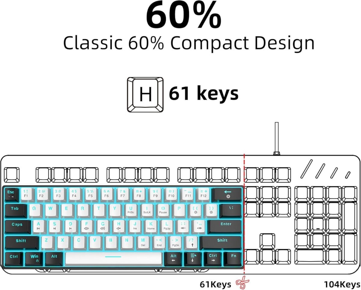 Snpurdiri 60% Wired Mechanical Gaming Keyboard, Ice Blue LED Backlit 61 Keys Mini Wired Office Keyboard for Windows Laptop PC Mac (Black-White, Blue Switches)
