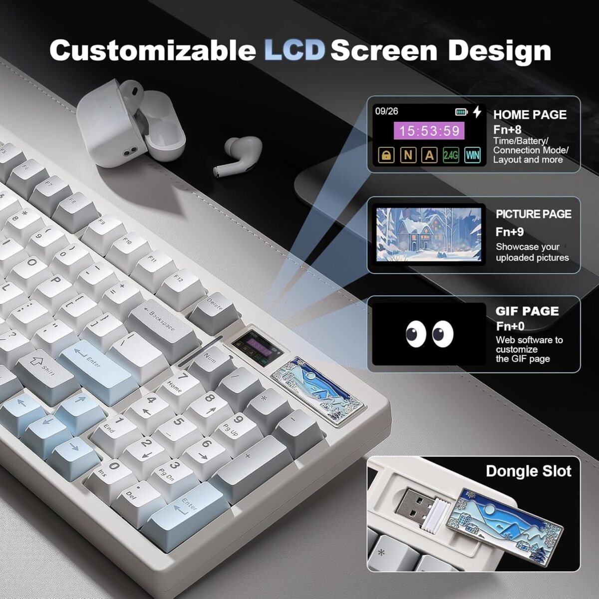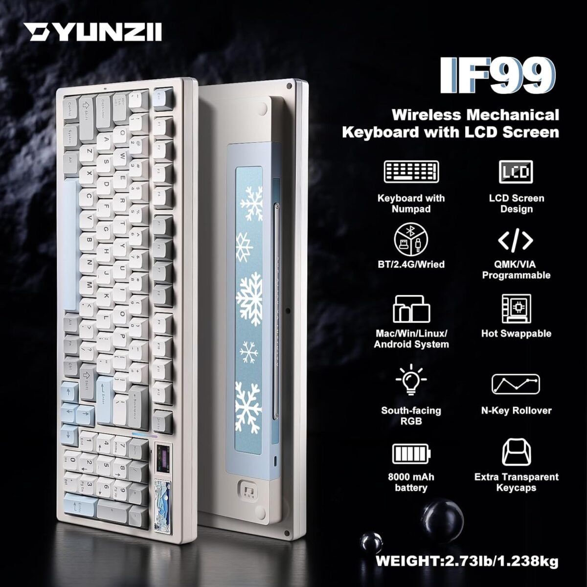 Custom LCD Keyboard for Personalized Display:YUNZII IF99 wireless mechanical keyboards features a customizable LCD screen that can display time, GIFs, photos, battery status, connection mode, and more. Personalize it with your favorite images, like pets or loved ones, to keep you motivated during work or gaming. Enjoy an added touch of personalization that sets your computer keyboard with screen apart.